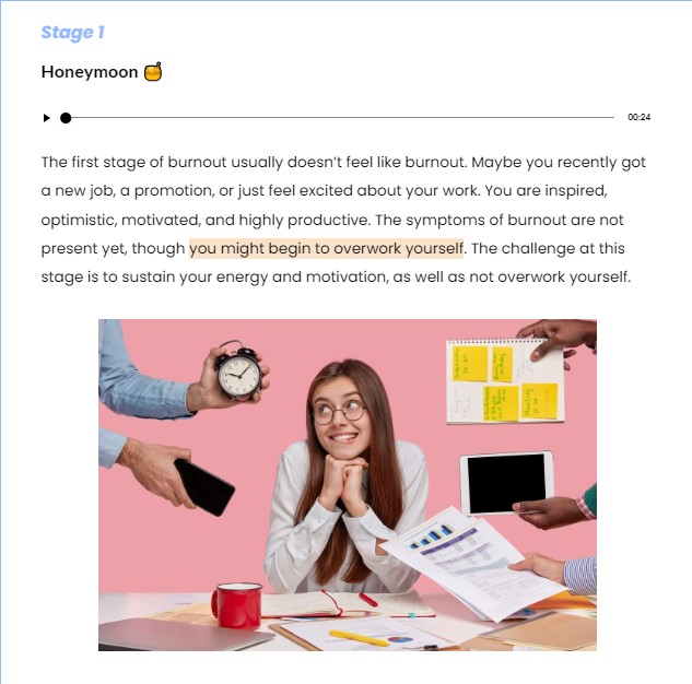 This sample course is aimed at raising awareness about occupational burnout among employees.*