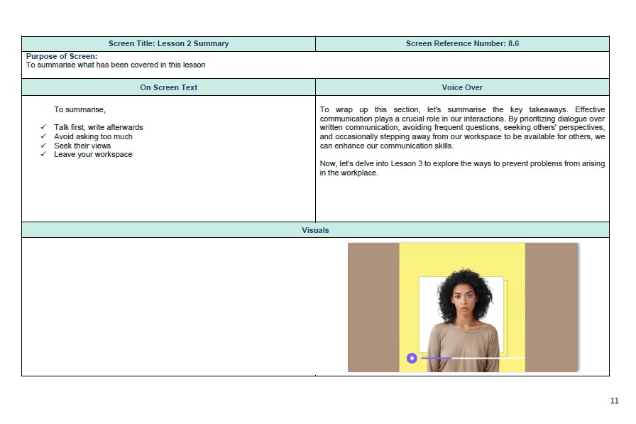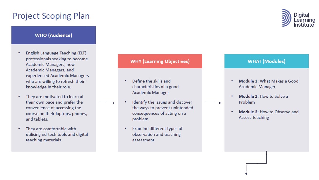 While mapping out the content, to avoid overwhelming participants with excessive input and causing cognitive overload, I broke down the modules into digestible chunks. I put them all together (WHO, WHY and WHAT) and brought out the project scoping plan at the end of this stage.